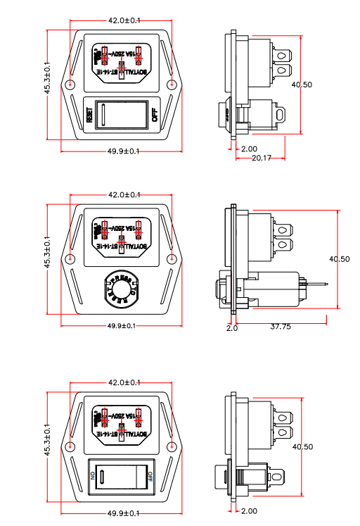 QN14系列 過載+開關(guān) 額定電流(rating): QN14 15A 125/250Vac 介電強度(Withstand voltage strength): >1500VAC/1min 絕緣電阻(Insulation Resistance): >100MOHM (DC 500V) 工作環(huán)境(Operating Ambient Temperature): -10℃ to +60℃