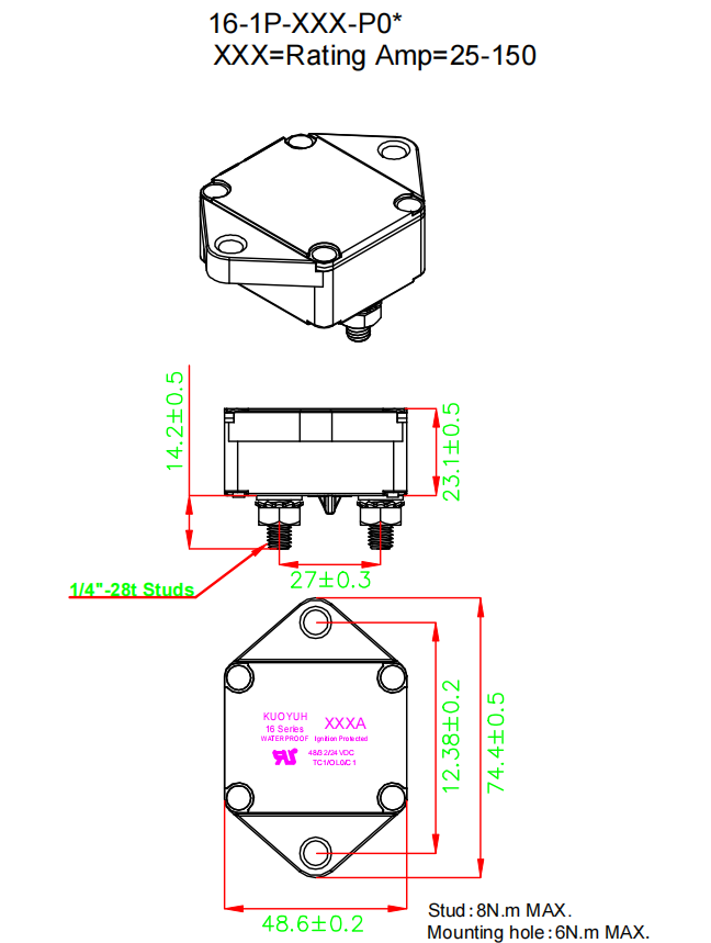 額定電流(Current rating range):25A-150A 額定電壓(Input voltage rating ):12/24/32/48VDC 復(fù)位方式(Reset): 自動(dòng)復(fù)位(Auto Reset) 限制短路電流(Interrupting capacity): 2000A/32VDC Type I 2000A/14VDC Type II 1500A/48VDC Type III 介電強(qiáng)度(Dielectric Strength):>1500VAC/min 絕緣電阻(Insulation Resistance):>100MOHM(DC 500V) 防護(hù)等級(jí)(Degree of protection):IP66 復(fù)位時(shí)間(Reset-Time):<60sec 工作環(huán)境溫度(Operating Temperature Rating):-30℃-80℃ 儲(chǔ)存溫度(Storage Temperatur Rating):-30℃-140℃ 上一個(gè)