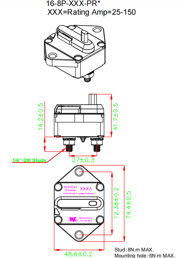 額定電流(Current rating range):30A-150A 額定電壓(Input voltage rating ):12/24/32/48VDC 限制短路電流(Interrupting capacity): 2000A/32VDC Type I 2000A/14VDC Type II 1500A/48VDC Type III 介電強度(Dielectric Strength):>1500VAC/min 絕緣電阻(Insulation Resistance):>100MOHM(DC 500V) 防護等級(Degree of protection):IP66 復(fù)位時間(Reset-Time):<60sec 工作環(huán)境溫度(Operating Temperature Rating):-30℃-80℃ 儲存溫度(Storage Temperatur Rating):-30℃-140℃ |