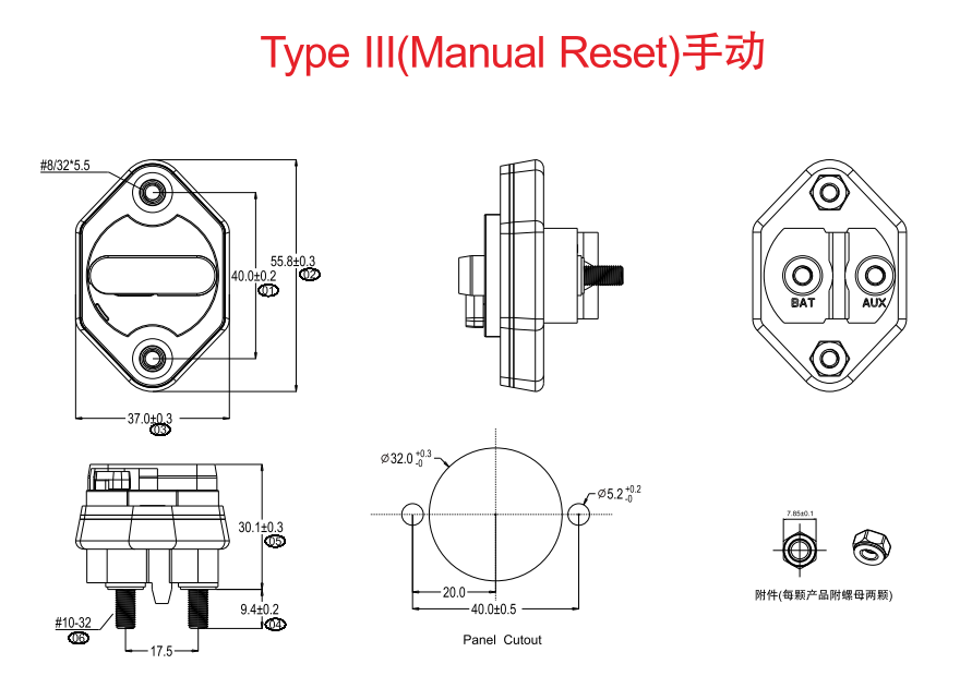 額定電流(rating):10A-60A 輸入電壓(Input Power):125VAC/250VAC/32VDC 50-60Hz 耐電壓強(qiáng)度(Withstand voltage strength):1500VAC/1min 漏電電流≤0.5mA(1500VAC/min,the leaked current is less than≤0.5mA) 絕緣電阻(Insulation Resistance):500VDC1Min≥100MΩ 額定短路能力(Rated short-circuit capacity):125VAC/1000A,250VAC/1000A 額定通斷能力(Rated breaking capacity):6倍額定電流(6 times rated current) 復(fù)位方式(reset):手動(dòng)復(fù)位(Manual Push Reset)/自動(dòng)復(fù)位(Auto Reset) 復(fù)位時(shí)間(Reset Time):60s"內(nèi)回復(fù)(Within 60s") 脫扣特性(Tripping characteristics) 測(cè)試環(huán)境溫度(The test environment temperature):25℃±3℃ 額定電流200%(200% of Ratcd Currcnt):8-40s" 內(nèi)脫扣(8-40s" Seconds Trip) 額定電流150%(150% of Rated Current):一個(gè)小時(shí)內(nèi)脫扣(Trip within 1 Hour) 額定電流100%(100% of Rated Current):保持不脫扣(Hold,No Trip) |